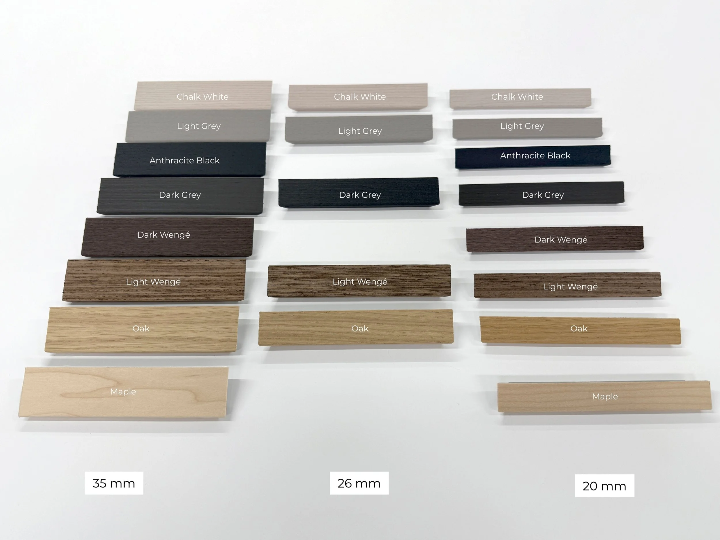 Many different color options: Chalk White, Maple, Oak, Light Wenge, Dark Wenge, Light Grey, Dark Grey, and Anthracite Black.